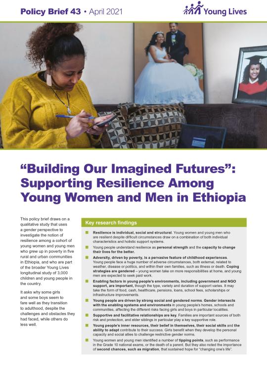This policy brief draws on a qualitative study that uses a gender perspective to investigate the notion of resilience among a cohort of young women and young men who grew up in poverty in five rural and urban communities in Ethiopia, and who are part of the broader Young Lives longitudinal study of 3000 children and young people in the country. It asks why some children seem to fare well as they transistion to adulthood, despite the challenges and obstacles they had faced, whilst others do less well.