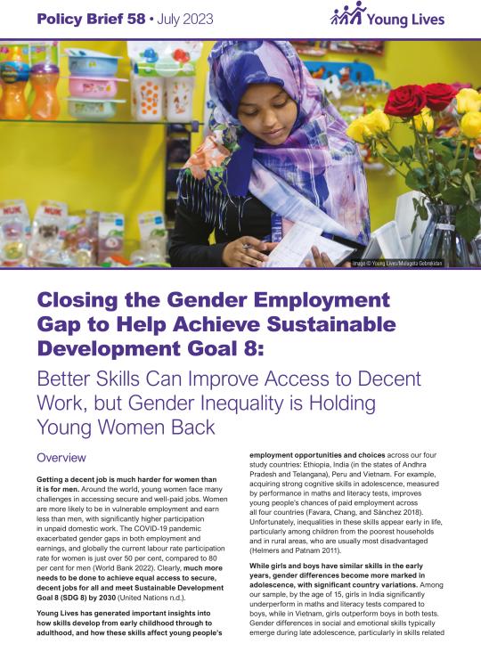 This policy brief summarises Young Lives research findings on skills and the gender employment gap across our four study countries, and presents key policy recommendations to better support women’s participation in paid employment and achieve gender equality.