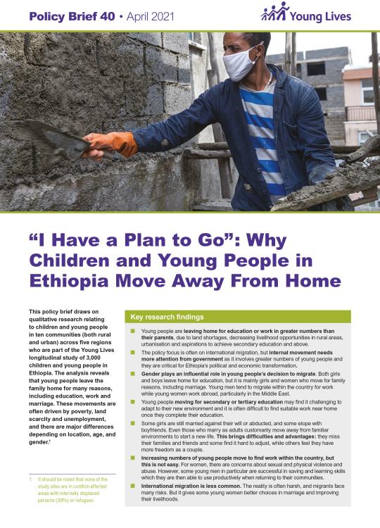 The brief is based on Birhanu et al. (2020) “A Stranger in All Places”: Patterns and Experiences of Mobility and Migration Among Adolescents and Young People in Ethiopia, Young Lives Working Paper 194 and is one of a set of eight summarising key findings and policy implications from research for the Young Lives fifth wave qualitative survey in 2019. This research was funded by UNICEF Ethiopia, and the working paper and this brief were funded by the Foreign, Commonwealth & Development Office.