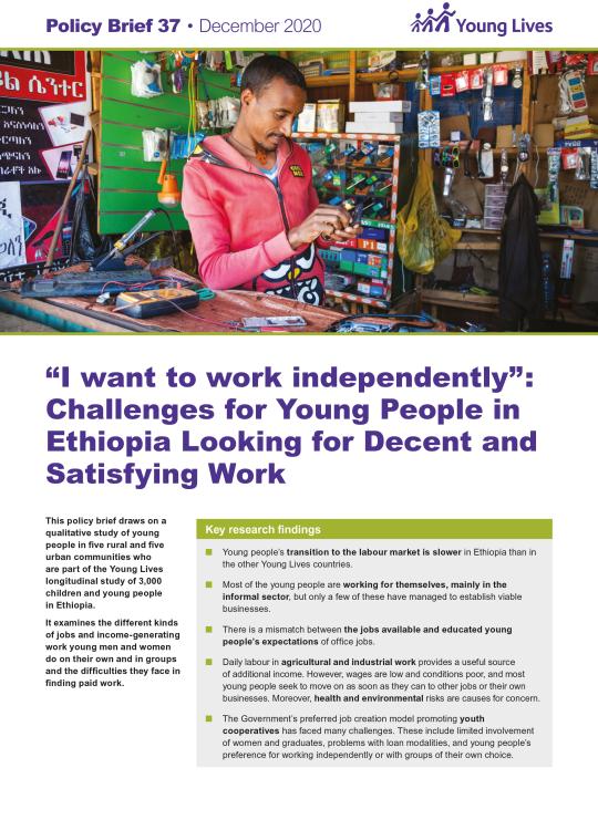 Drawing on a qualitative study of young people in five rural and five urban communities who are part of the Young Lives longitudinal study of 3,000 children and young people in Ethiopia, this policy brief examines the different kinds of jobs and income-generating work young men and women do on their own and in groups and the difficulties they face in finding paid work.