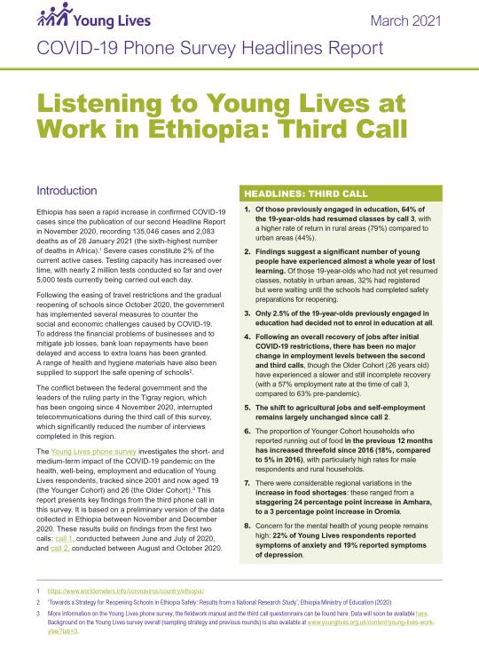 This brief report provides headline findings from the third call in Young Lives at Work's COVID-19 Phone Survey in Ethiopia.