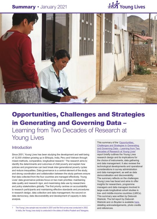 This summary of the ‘Opportunities, Challenges and Strategies in Generating and Governing Data – Learning from Two Decades of Research at Young Lives’ report briefly outlines the Young Lives research design and its implications forthe choice of instruments, data gathering and data management. It also reviews the technological developments and operational considerations in survey administration and data management, as well as data democratisation and discoverability.