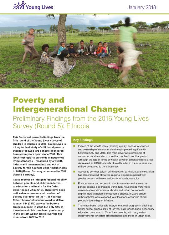 This fact sheet presents findings from the fifth round of the Young Lives survey of  children in Ethiopia in 2016. Young Lives is  a longitudinal study of childhood poverty  that has followed two cohorts of children born seven years apart since 2002. This fact sheet reports on trends in household living standards – measured by a wealth index – and movement into and out of poverty for the Younger Cohort households in 2016 (Round 5 survey) compared to 2002 (Round 1 survey). It also reports on intergenerational mobility between parents and children in terms of education and health for the Older Cohort (aged 22 in 2016). There have been noticeable movements into and out of poverty over time. Of the 1,741 Younger Cohort households interviewed in all five rounds, 584 (33%) were in the bottom tercile (i.e. poor) in 2002, but only 12% of these households have been persistently in the bottom wealth tercile over the five rounds from 2002 to 2016.